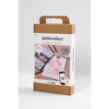 Lär dig att måla akvarell med detta startset! Setet innehåller allt material och alla instruktioner du behöver för att komma igång. Skanna QR-koden på paketet för att öppna dörren till ett stort bibliotek med instruktionsvideor där du får lära dig olika tekniker för att måla akvarell, och skapa en egen vacker tavla.