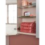 Spegelskåpens insida följer utsidans kulör och har flyttbara hyllor i glas. Spegelluckor har nackspegling och dämpare för mjukstängande effekt.