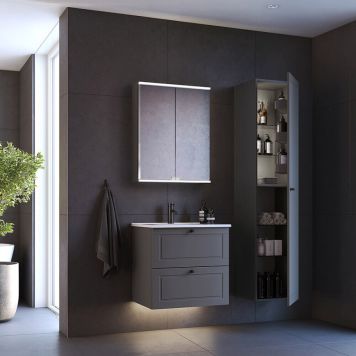 Med detta 80 cm breda möbelpaket får du dansk design i toppklass med smart funktionalitet. Det vita Balans tvättstället i sanitetsporslin är både rengöringsvänligt och extremt hållbart – perfekt för daglig användning. Det grå tvättställsskåpet med två rymliga lådor och ramfront ger dig gott om plats, och det matchande Valera spegelskåpet med grå sidor kompletterar helheten med extra förvaring. En komplett lösning där form och funktion möts på bästa sätt.