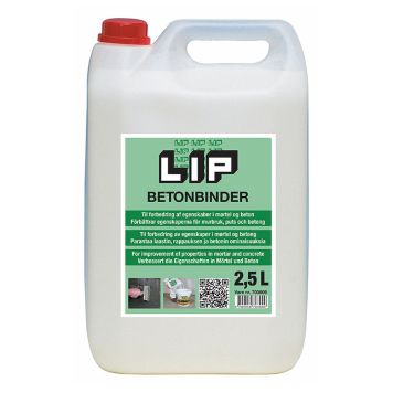 Denna betongbinder från Lip är ett vattenbaserat tillsatsmedel som kan användas både inomhus och utomhus. Den används som tillsats till cementbaserat bruk och betong och ökar bearbetbarheten. Den kan dessutom användas som tillsatsmedel i putsbruk, och ger ökad flexibilitet och tryckhållfasthet när den tillsätts i bruket. Den har en viss vattenavvisande effekt och ökar murbrukets motståndskraft mot kemisk påverkan. Tillsats av betongbinder minskar risken för sprickbildning i murbruket/puts-ytan och ger generellt ett mer hållbart murbruk/puts.