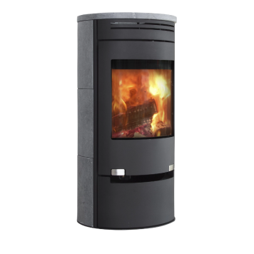 Braskaminen är klädd med täljsten på toppen och sidorna. Täljsten är dekorativt och funktionellt på samma gång. En naturprodukt där varje enskild sten är unik i färg och struktur samtidigt som den tar upp värme och avger den under en längre tid.