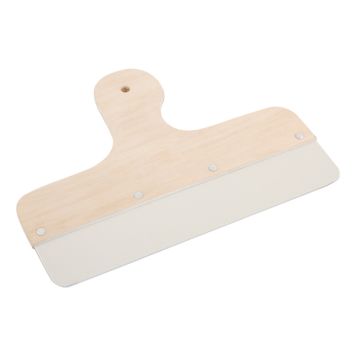 Bredspackel med trähandtag och blad av plast (polystyren). För bl.a. montering av våtrumsfolie eller vävduk.