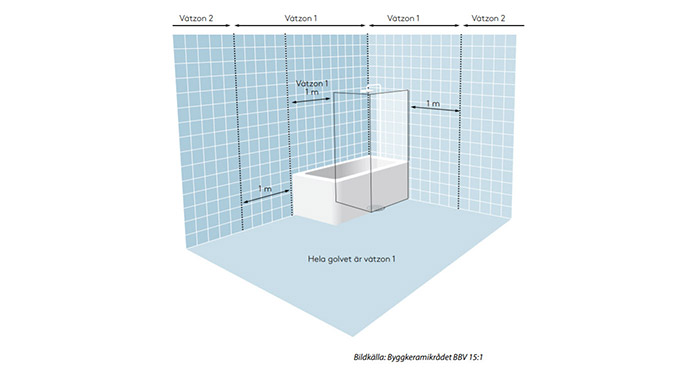 Väggar vid dusch/badkar och väggytor minst 1 meter utanför dessa, samt hela golvytan. När duschplats/badkar på någon sida omges av skärmvägg som ska plattsättas ingår även den våtzon 1. Om delar av en ytterväg ingår i våtzon 1 ska hela väggen behandlas som tillhörande våtzon 1.