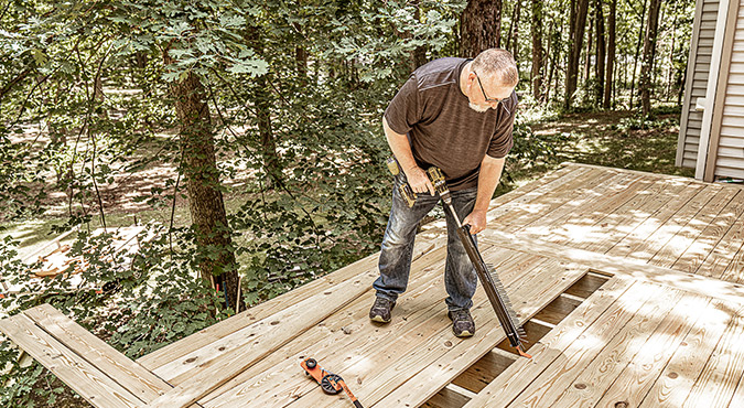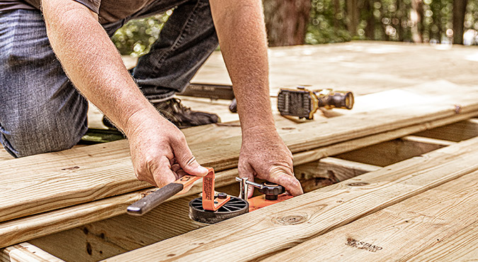 Bygg tralldäck upp till 5X snabbare med sladdlösa CAMO DRIVE. Fäst din skruvdragare i förlängningsarmen och skruva trallen stående.