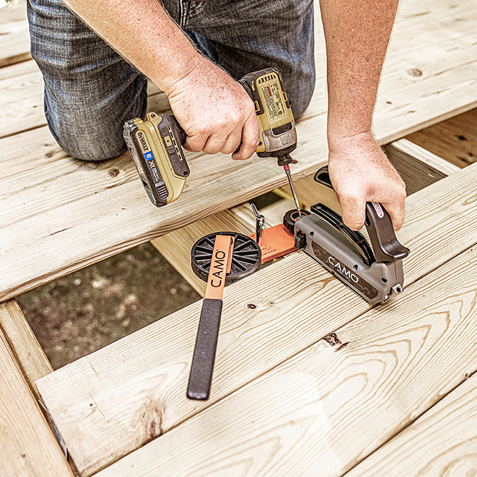 Oavsett om du använder bandad dold trallskruv, clips på spårfräst trall eller bandad klassisk toppskruvad trallskruv – är CAMO DRIVE det enda verktyget du behöver.