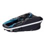 Vagnen har en aerodynamisk design med en aluminiumram som ger högsta säkerhet och stabilitet. På baksidan finns förvaringsutrymme för extra bekvämlighet. Det extra långa solskyddet ger utmärkt skuggning och skydd mot solen. För ökad säkerhet har vagnen ett justerbart fempunktsbälte och en parkeringsbroms på handtaget.