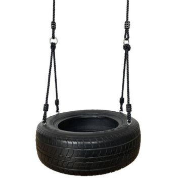 Däckgunga tillverkad av målade, återvunna däck inklusive justerbart rep för enkel montering på gungställningen.