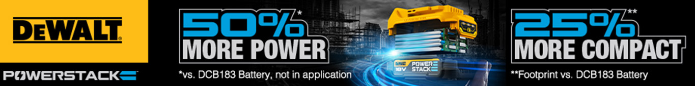 Gör dig redo för prestanda som du aldrig sett förut. 18V DEWALT POWERSTACK™ batteri drar nytta av platta battericeller som staplas på varandra vilket ger ett revolutionerande kompakt batteri som även är vårt mest kraftfulla och lättaste batteri. Med 2X livslängd baserat på laddningscykler jämfört med DEWALT 2Ah kompakta batterier (DCB183), kommer denna banbrytande innovation att driva branschen framåt.
