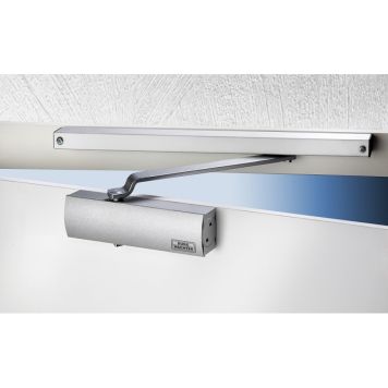 Dörrstängare med justerbar stängningshastighet och slutspärr, spärruppställningsarm ingår. Dörrstängaren är ett elegan...