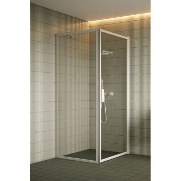 Stadig duschhörna i lyxig design som skyddar mot stänkvatten genom klart och tåligt säkerhetsglas. Hörnan består av en fast duschvägg och en vändbar duschdörr. Dörren öppnar sig 90 grader utåt och är försedd med justerbar centrering. Centreringen strävar efter att återställa dörren till öppen respektive stängd position. Magnettätningar håller dörren tätt stängd medan duschen används. I de flesta duschutrymmena passar golvprofilen utmärkt till duschväggen, men vid golvlutning över 7 mm bör den justebara foten med sockeltätning beställas istället.