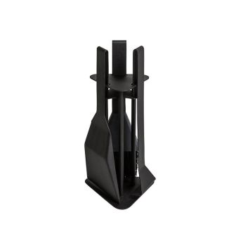 Modernt stabilt eldställ i svensk design. Eldstället har en praktisk uppsamlingskopp för använda verktyg. Vedhaken har en ”blåsrörsfunktion för syresättning av elden.