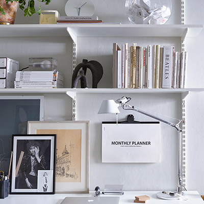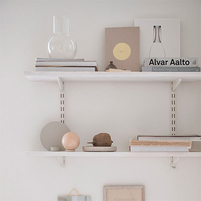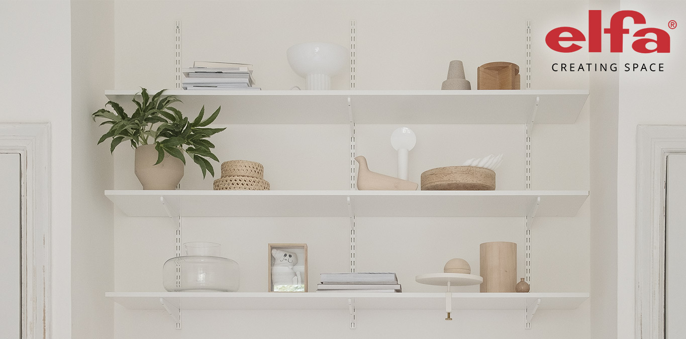 Detta system består av väggskenor, konsoler och hyllplan i melmain.