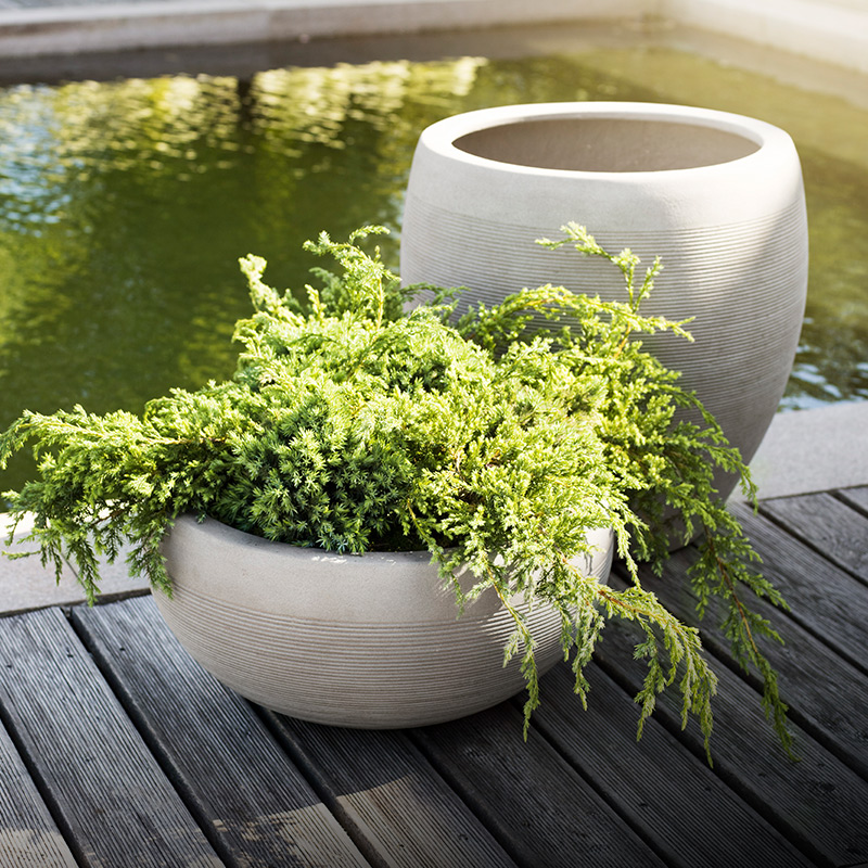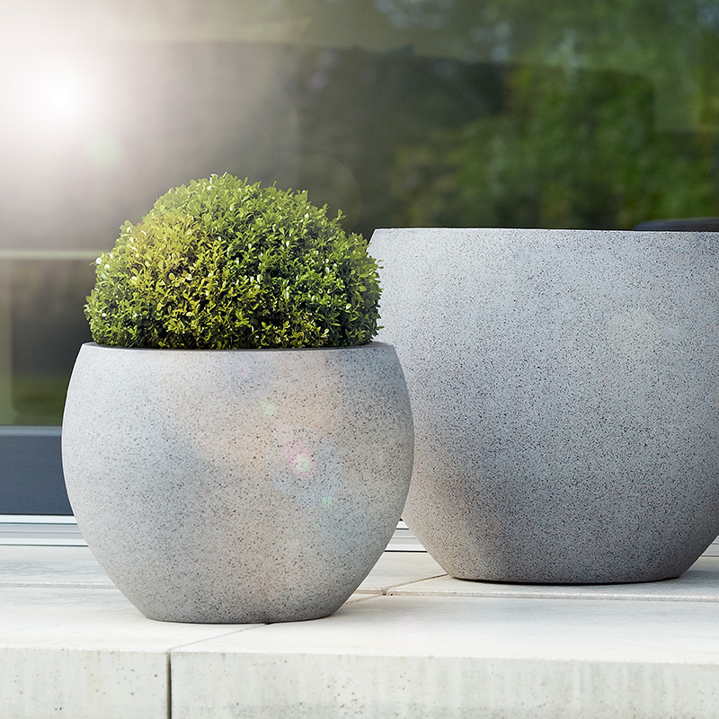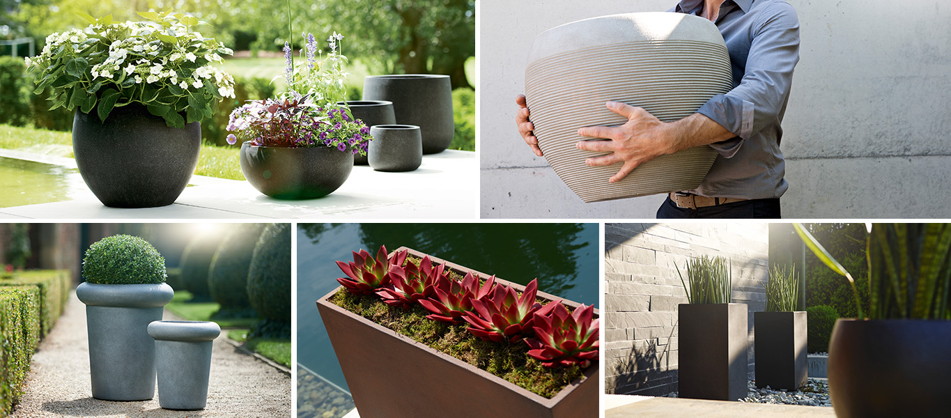 Välj mellan runda och fyrkantiga krukor, svarta eller gråa krukor, eller kanske en kruka från den autentiska kollektionen Naturelite som speglar betongens vackra mönster.