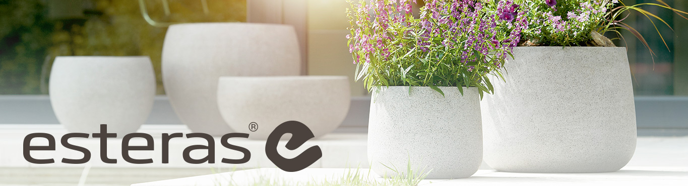 Esteras krukor tillverkas i glasfiber för att göra dem så naturtrogna som möjligt. En annan fördel med glasfiber är även att de blir upp till 70% lättare än om de hade varit i riktig sten. Glasfibern gör också krukorna återvinningsbara!