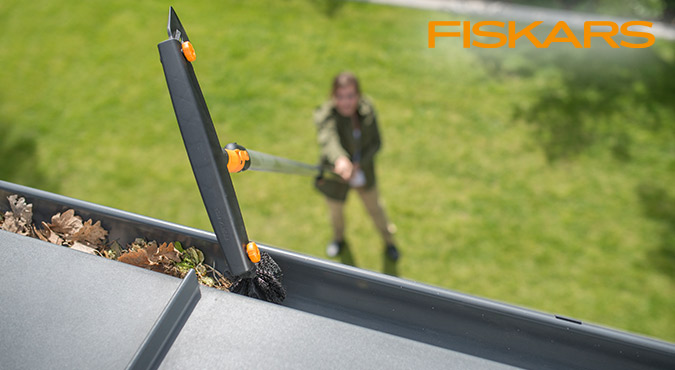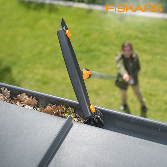 När rännan är helt rengjord, skölj den ett varv med vatten. Takrännerensaren används bäst tillsammans med Fiskars teleskopskaft.