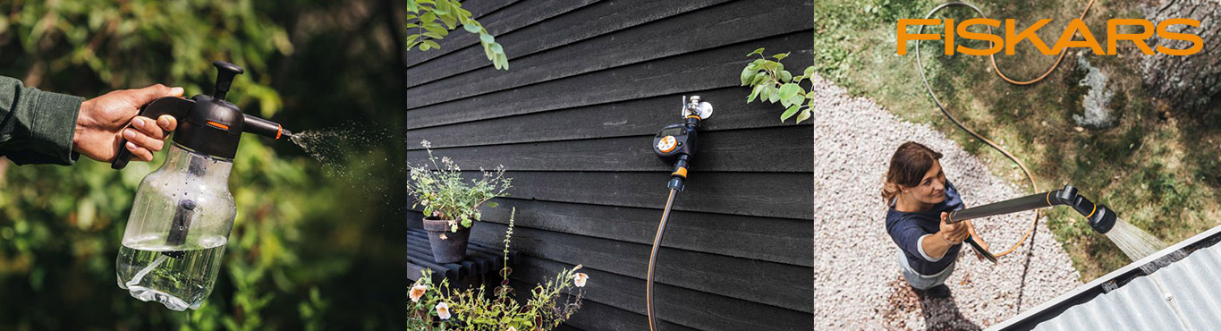 Fiskars funktionella bevattningssortiment erbjuder ett brett utbud av redskap och tillbehör designade för olika uppgifter så som bevattning i trädgården, av gräset och trädgårdsland samt rengöring av terrasser, cyklar och bilar.