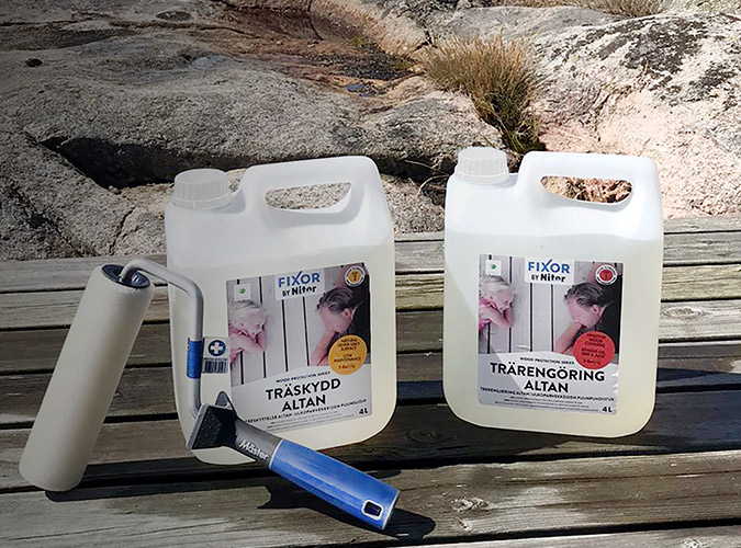 OBS! Produkten bör inte användas inomhus eller på träytor i inglasade uterum som aldrig utsätts för väder och vind. Du kan heller inte behandla träytor som slipats ned till kärnvirket. Vi avråder därför från alla typer av slipning annat än lättare slipning för hand (använd inga slipmaskiner). Nitor Wood Protection etsar på glas, skydda därför glasytor, tvätta omedelbart bort ev. stänk med rent vatten!