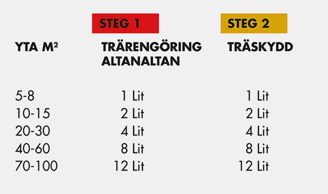 5-8 m2/liter beroende på träytans kvalité och ålder. Behandlingen bör utföras i samband med att det är uppehållsväder i ett par dagar och från temperaturen +5°C och uppåt. När du är klar väntar den perfekta altanen på dig. Bara att njuta!