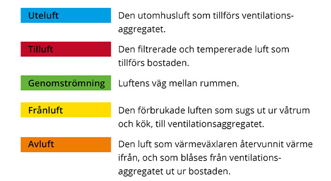 Här finns de färgkoder som beskriver luftens väg i ditt hus.