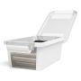 Denna mångsidiga förvaringslåda i plast är perfekt för att organisera och förvara allt från kläder och leksaker till andra hushållsartiklar. Tillverkad av hållbar PVC erbjuder denna låda en robust och pålitlig lösning för dina förvaringsbehov. Locket kan enkelt tas bort helt eller delvis vilket ger dig flexibilitet beroende på vad du behöver förvara. Dessutom är lådan designad med klämmor på locket för att säkerställa att innehållet hålls säkert på plats. En av de stora fördelarna med denna låda är att den kan staplas, vilket gör att du kan spara värdefullt utrymme i ditt hem eller kontor!