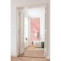 Sätt upp tapeten längs strecken på väggen. Stryk uppifrån och nedåt för att jämna ut tapeten, hjälp till med handen från mitten ut mot kanterna för att kontrollera att det inte finns några bubblor kvar. Vi rekommenderar att tapeten överlappas med ca. 2–3 mm eftersom den kan krympa när den torkar.