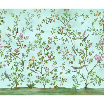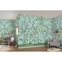 Vacker tapet med motiv av blommor och fåglar i en turkos värld. Perfekt för dig som vill ha naturen lite närmare.