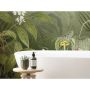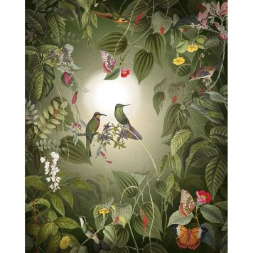 Inramade av vinstockar och gröna löv har två fåglar gjort sig bekväma på en gren. De skimrande färgglada fjärilarna kompletterar bilden och ger fototapet ett exotiskt utseende. Tapeten passar utmärkt i alla rum i hemmet där man vill ha en lugnande atmosfär.