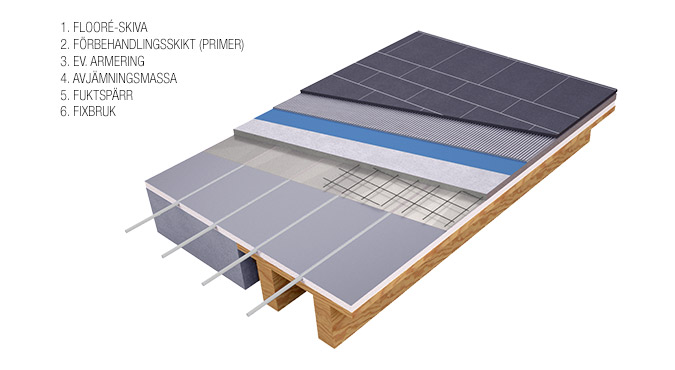 Om bjälklaget består av betong behövs ingen armering. Därefter appliceras avjämningsmassa (spackel) enligt tillverkarens rekommendationer.