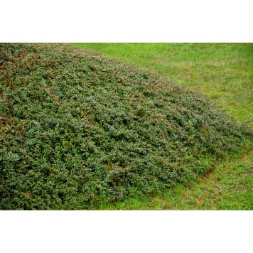 Cotoneaster x suecicus Coral Beauty, även känd som svenskt parkoxbär eller krypoxbär, är en robust och mångsidig buske som passar utmärkt som marktäckare eller lågt insynsskydd. Med sitt täta, krypande växtsätt och mörkgröna, blanka blad bildar den en elegant och prydlig matta i trädgården. Under våren täcks busken av små, vita blommor som lockar bin och andra pollinerare, och dessa följs på sensommaren av lysande orange-röda bär som sitter kvar långt in på vintern. Coral Beauty är särskilt uppskattad för sin tålighet och förmåga att trivas i både sol och halvskugga, samt i olika jordtyper. Dess vintergröna blad gör den till ett vackert inslag året runt, och de färgstarka bären blir snabbt en favorit hos småfåglar. Den är idealisk för att skapa en lättskött och estetiskt tilltalande trädgård, oavsett om du vill täcka sluttningar, använda den som kantväxt eller plantera i grupper för en frodig effekt. Beskärning är sällan nödvändig men kan göras efter behov för att bibehålla formen. Med Coral Beauty får du en buske som kombinerar hållbarhet med elegans! Bilden visar växten som fullvuxen och etablerad.