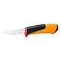 Fiskars nya serie av snickarknivar har blad i högkvalitets stål samt integrerad slip i fodralet. Fodralet kan du dessutom vända beroende på vänster eller höger hantering. Du kan även fästa ihop flera fodral sidledes. Skaftets baksida har slagyta för hammare och har dessutom en soft grip beläggning för ett säkert och bekvämt grepp oavsett väder.