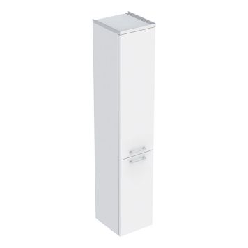Praktiskt högskåp från Ifö med genomtänkt förvaring. I högskåpet finns ett fast hyllplan och tre flyttbara glashyllplan. Det finns även förvaringsboxar på dörrens insida. Dörren är mjukstängande. Vänster- eller högerhängning kan väljas vid montering.