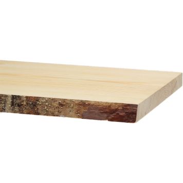 Hyllplan i sold furu där träets naturliga ringar framhävs. Ena kanten har lämnats orörd och rustik, vilket gör va...
