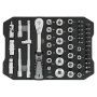 Set med hylsor och skaft som är utmärkt att använda för att komma åt i trånga utrymmen. Hylsorna är av speciellt kromvanadinstål och väskan i robust metall. Hylsnycklarna har en växlingsspak för höger och vänster med snabbkopplingsfunktion.