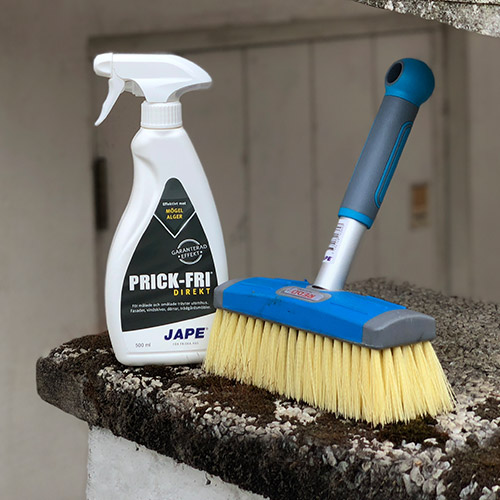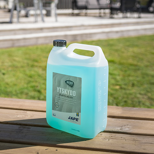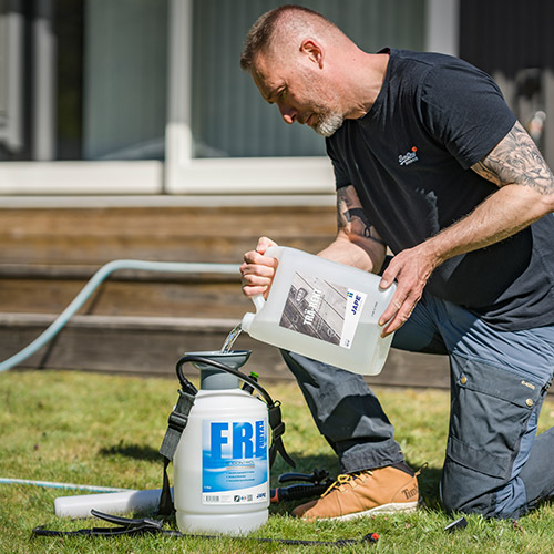 Om ytan har påväxt elimineras denna med Grön-fri och en Fri-Spruta. Därefter rengörs ytan med Redo Trä-Rent och en Redo Trallborste. När ytan är ren och torr kan Redo Ytskydd appliceras med en Fri-Spruta.