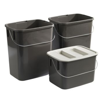 Set med tre kärl lämpligt för skåp eller låda. Den medföljande väggfäste passar både 7 liters och 12 liters kärl.