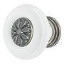 Knoppen har en bas i gjuten zink med ett yttre i vit porslin. Handtaget fästs från insidan med en M4 skruv.