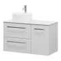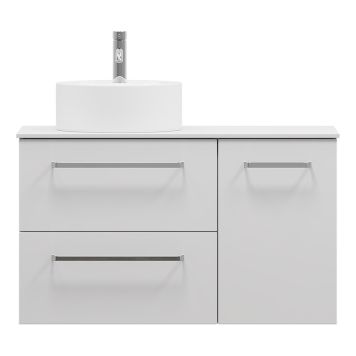 Komplett badrumsmöbel innehållande ett fristående ovanpåliggande porslinstvättställ, underskåp tillsammans med sidoskåp med mattlackade lådfronter gör detta till en unik och stilren design. Bänkskivan är i en snygg och praktisk design tillverkad i det starka materialet Compact Melamin.