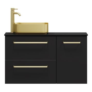 Komplett badrumsmöbel innehållande ett fristående ovanpåliggande modernt tvättställ i borstad mässing. Underskåp tillsammans med sidoskåp med mattlackade lådfronter gör detta till en unik och stilren design. Bänkskivan är i en snygg och praktisk design tillverkad i det starka materialet Compact Melamin.