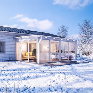 Ett monteringsfärdigt uterum levereras med färdigkapad stomme i limträ, skjutbara glaspartier och kanalplasttak. Våra kompletta uterum är anpassade för olika säsonger i olika storlekar.