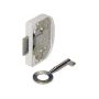 Ett platt utanpåliggande lås i plast. Fungerar att monter åt både höger och vänster. Nyckelhålet ligger 20mm från kanten och levereras med matchande nyckel.