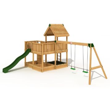 Projekt 5 med gungmodul består av två torn med klättervägg, ett torn med tak, sandlåda, stege, en gungmodul och en r...