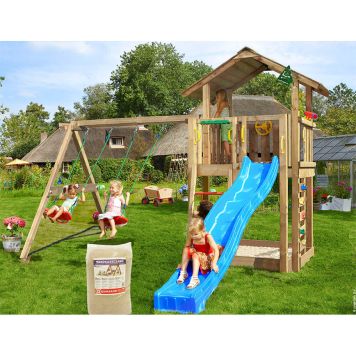 I Jungle Gym Chalet lektornet får de mindre äventyrare skydd från sandstormar och monsunvindar under det sluttande taket. Sedan när solen skiner passar det utmärkt att detta lektorn har en utskutande balkong. I botten av lektornet finns en sandlåda som är placerad i skuggan, där vackra sandslott kan ta form. Stegen är utrustad med halkfria stegpinnar och tornet kommer med en fin blå rutschkana. Utöver det så levereras denna komplett med tillhörande gungmodul med två stycken härliga gungor.