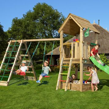Här är lektornet med riktigt trätak och klättermodul inklusive gunga, som kan ge många timmars utmanande lek i trädgården.