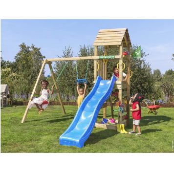 I detta paket medföljer klättervägg, klätterstenar, trestegstege, handtag, jordankare, borr/skruvar, beslag, skruvskydd, trätak, StarOscope (Teleskop), Jungle Steering Wheel (ratt), Jungle Gym flagga, gungställning med en gunga och en trapetsgunga, blå rutschkana 220 cm, huvudskydd, sandlåda och manual.