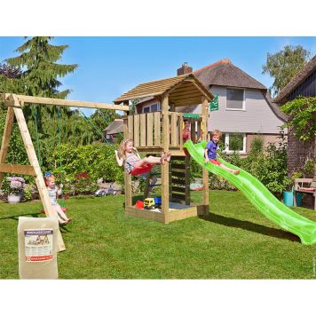 I Jungle Gym Cottage lektornet får de mindre äventyrare skydd från sandstormar och monsunvindar under det sluttande taket. I botten av lektornet finns en sandlåda som är placerad i skuggan, där vackra sandslott kan ta form. Stegen är utrustad med halkfria stegpinnar och tornet kommer med en fin grön rutschkana. Utöver det så levereras denna komplett med tillhörande gungmodul med två stycken härliga gungor.