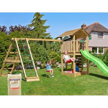 I Jungle Gym Cottage lektornet får de mindre äventyrare skydd från sandstormar och monsunvindar under det sluttande taket. I botten av lektornet finns en sandlåda som är placerad i skuggan, där vackra sandslott kan ta form. Stegen är utrustad med halkfria stegpinnar och tornet kommer med en fin grön rutschkana. Utöver det så levereras denna komplett med tillhörande klättermodul med klätternät och två stycken härliga gungor.
