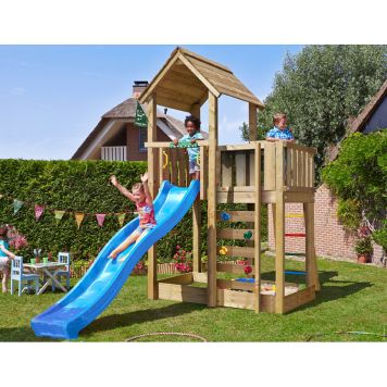I Jungle Gym Mansion lektornet får de mindre äventyrare skydd från sandstormar och monsunvindar under det sluttande taket. Det stora lektornet erbjuder både lek under tak och under öppen himmel tack vare sin balkong med gott om utrymme och är enkel att bygga ut med extra moduler om man är redo för ännu fler äventyr. I botten av lektornet finns en sandlåda som är placerad i skuggan, där vackra sandslott kan ta form. Stegen är utrustad med halkfria stegpinnar medföljande klättervägg är ett roligt inslag för alla klätterapor där ute! Lektornet kommer med en fin blå rutschkana.