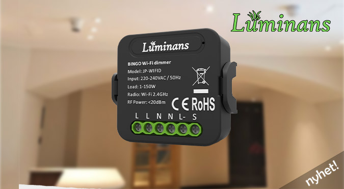 - Wi-Fi 1 och 2 kanals dosdimmer för LED (bakkantstyrt), glödlampor & halogen styrs via återfjädrande tryckknapp eller via App (Tuya Smart) i mobil eller surfplatta.