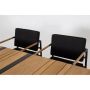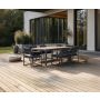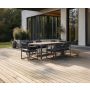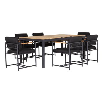 Detta stilrena möbelset kombinerar modern design med praktisk funktionalitet som är perfekt för att förnya din uteplats. Bordet har en robust aluminiumram och en bordsskiva i teak, vilket ger en hållbar och väderbeständig yta som är lätt att underhålla. Med sina justerbara mått från 180 centimeter till 248 centimeter i längd erbjuder detta bord flexibilitet för både intima middagar och större sammankomster. Möblernas svarta färg ger en tidlös elegans som passar i de flesta utomhusmiljöer.