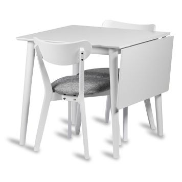 Denna stilrena matgrupp från Åland serien är den perfekta kombinationen av funktionalitet och estetik. Med en trendig vitlackad finish smälter den enkelt in i alla moderna hem. Bordet har en smart hängklaff som alltid sitter på sidan och kan enkelt fällas upp när du behöver extra utrymme, vilket gör det idealiskt för både vardag och fest. Med en längd på 80 till 120 centimeter passar den perfekt för mindre sammankomster och utrymmen. Den robusta konstruktionen av vitmålad mdf säkerställer att denna matgrupp inte bara är vacker utan också hållbar och långvarig. Oavsett om du har en intim middag för två eller en större sammankomst, anpassar sig denna matgrupp efter dina behov!